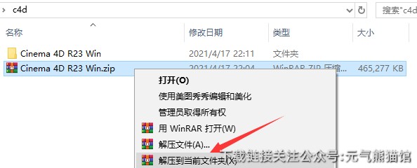 1.把资源从百度网盘下载到电脑上面,右键c4d23—解压到当前文件夹。