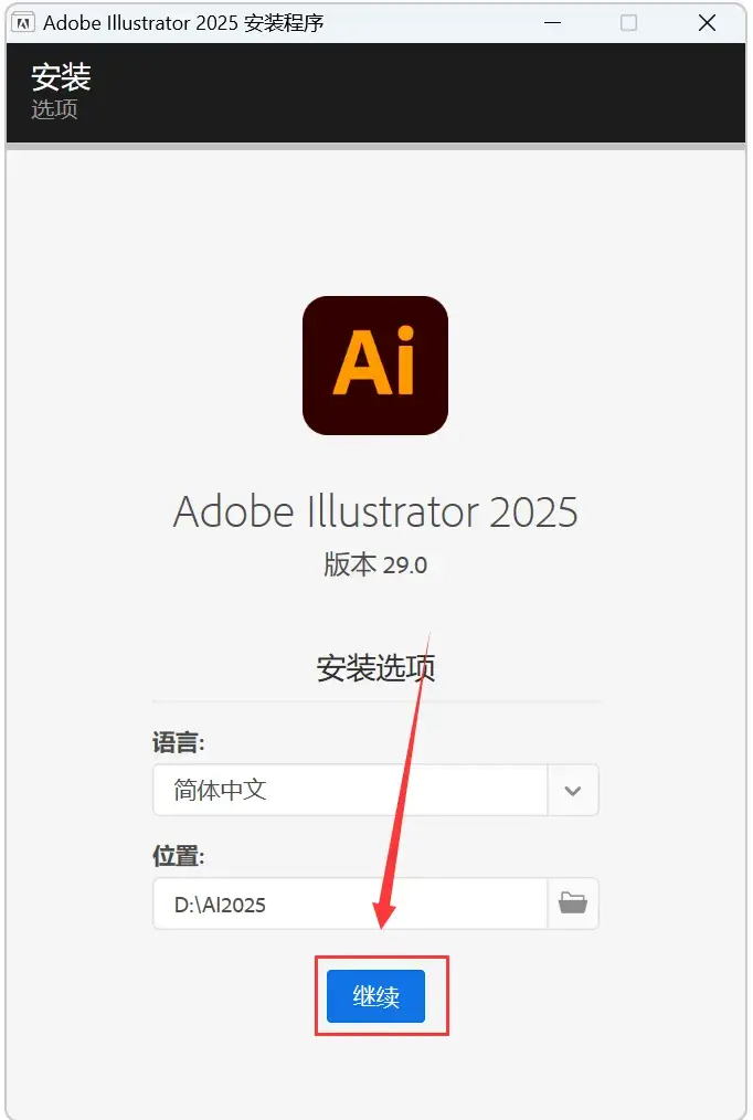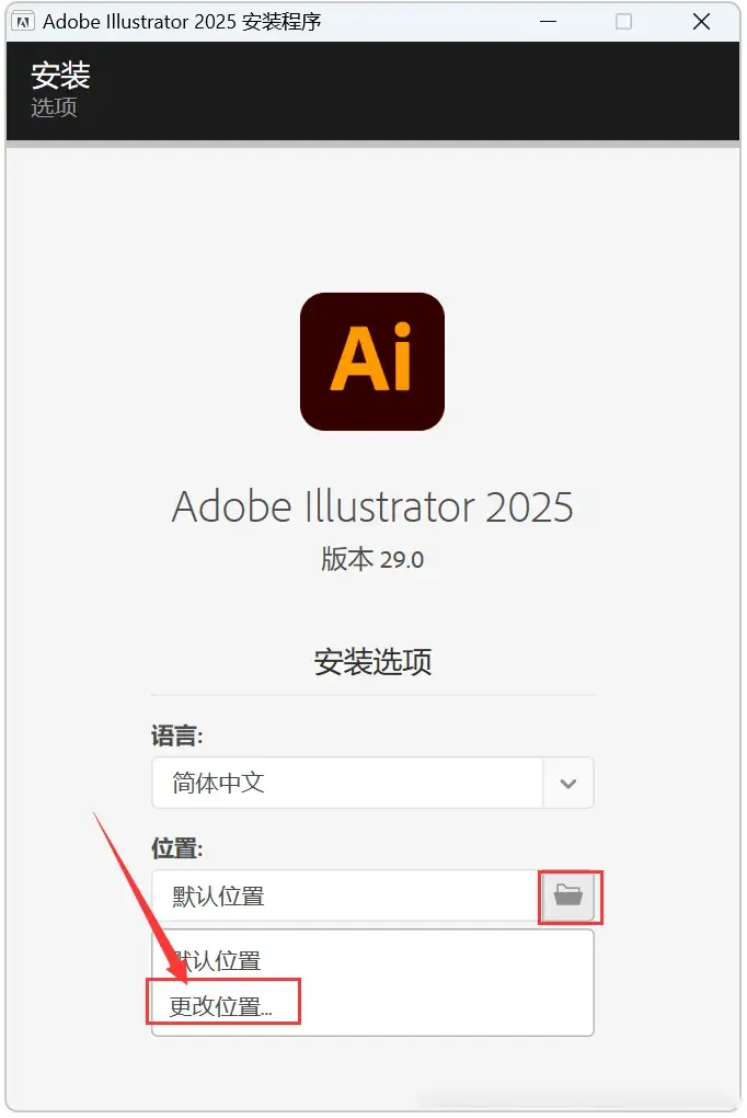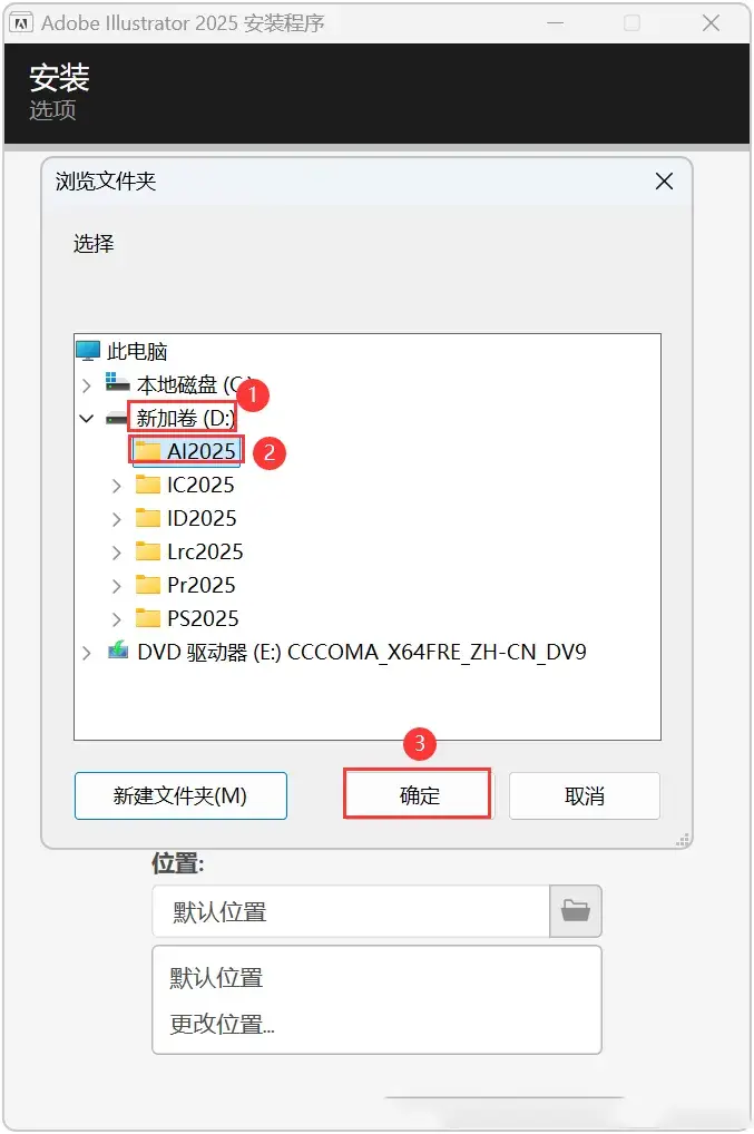 4.修改安装位置:①点击需要将软件安装的磁盘位置(如:D盘)②新建一个【Ai2025】文件夹并选中③点击【确定】。