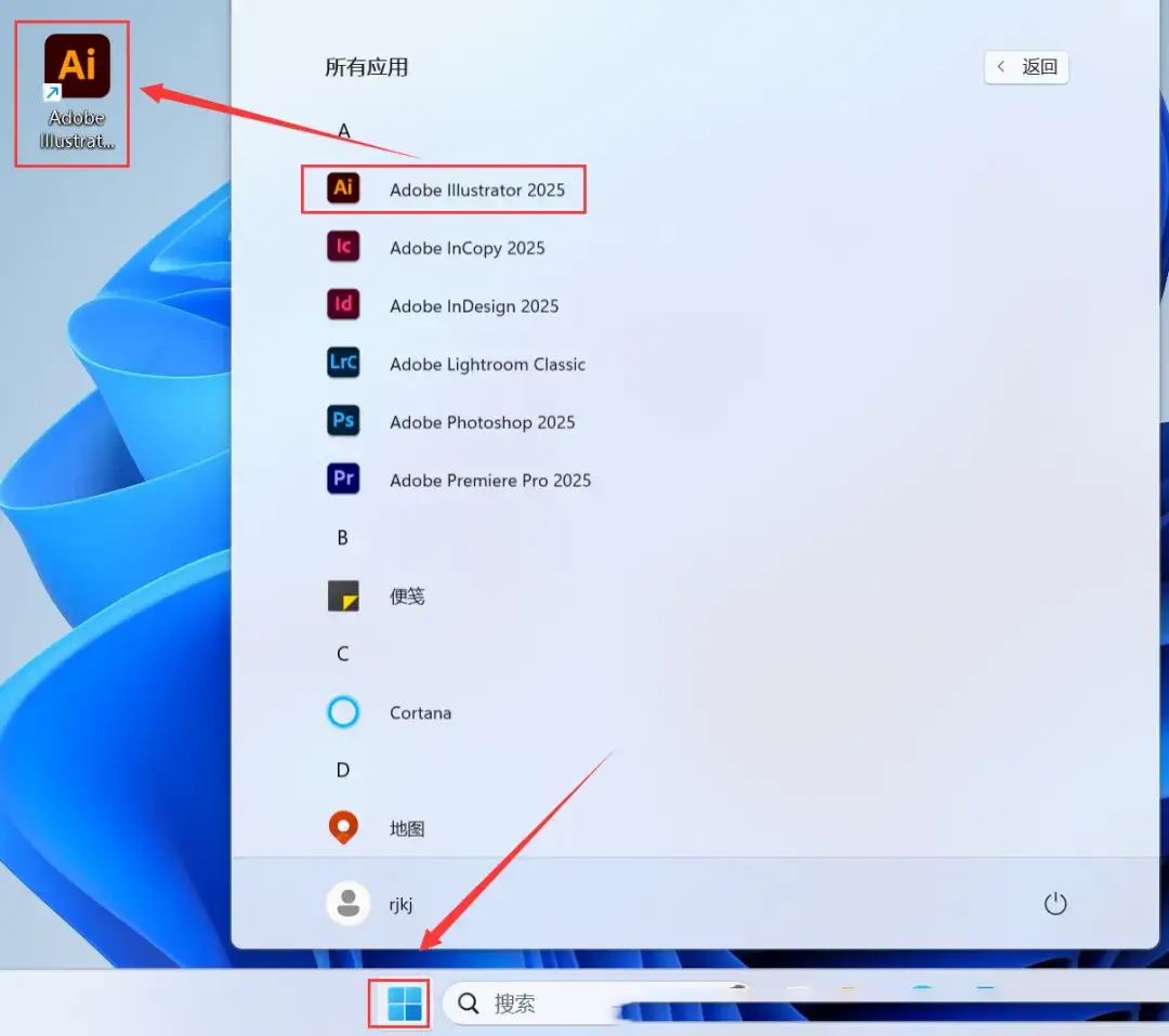 8.创建桌面快捷方式:点击桌面任务栏中的【开始图标】>点击【所有应用】,将【Adobe Illustrator 2025】图标拖到电脑桌面。