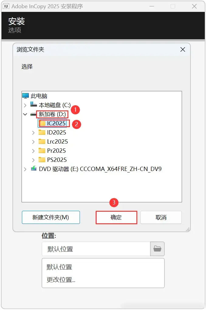 4.修改安装位置:①点击需要将软件安装的磁盘位置(如:D盘)②新建一个【IC2025】文件夹并选中③点击【确定】。