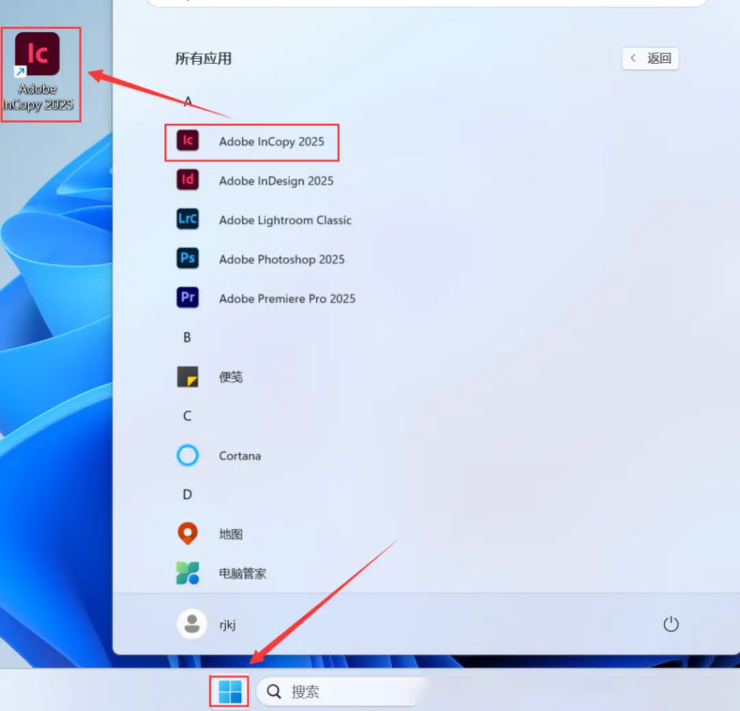 8.创建桌面快捷方式:点击桌面任务栏中的【开始图标】>点击【所有应用】,将【Adobe InCopy 2025】图标拖到电脑桌面。
