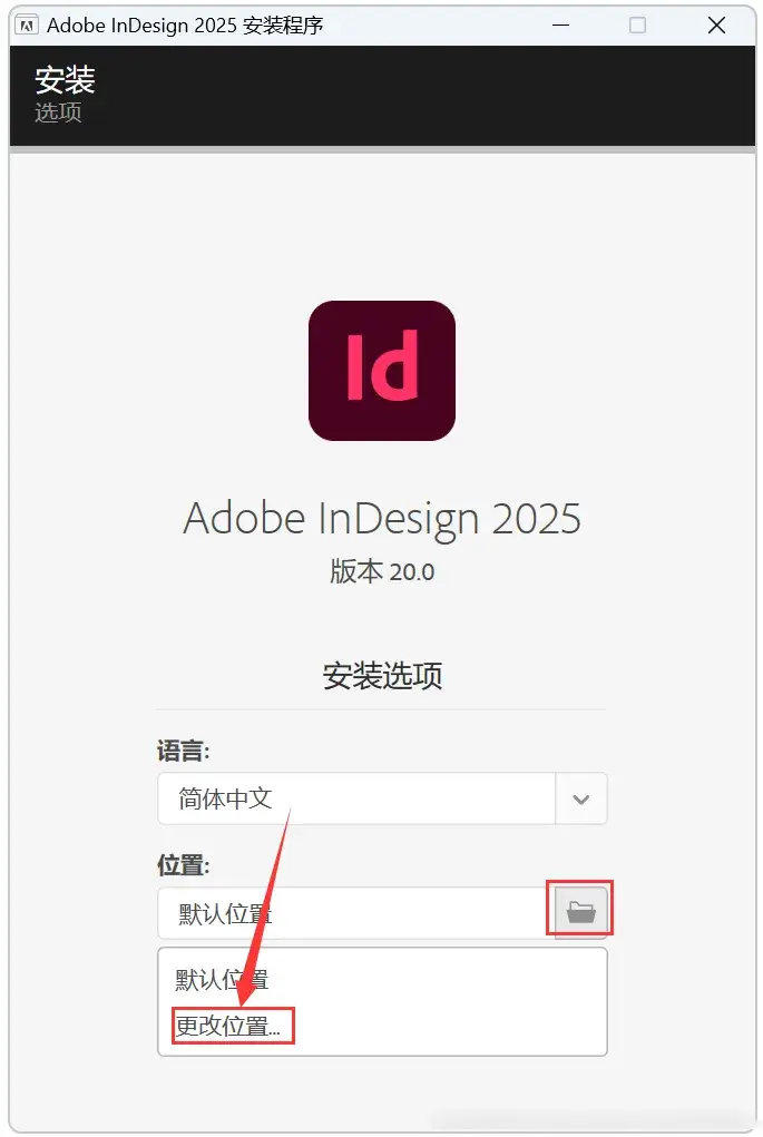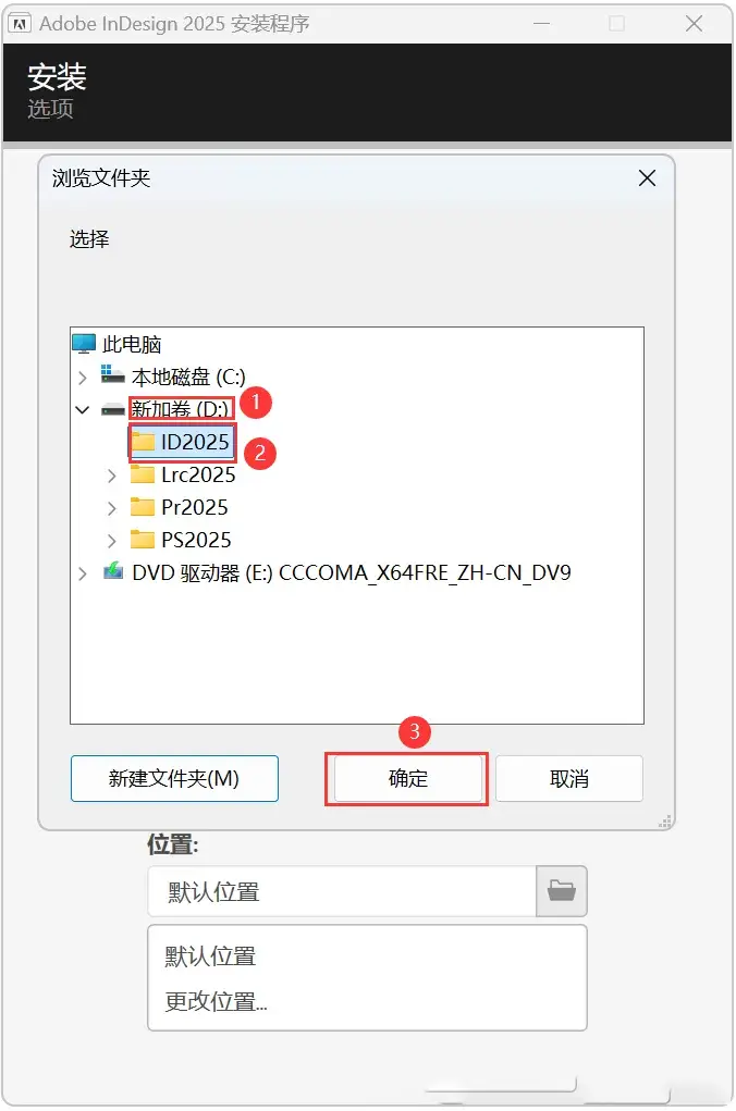 4.修改安装位置:①点击需要将软件安装的磁盘位置(如:D盘)②新建一个【ID2025】文件夹并选中③点击【确定】。