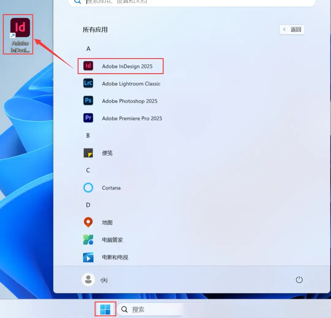 8.创建桌面快捷方式:点击桌面任务栏中的【开始图标】>点击【所有应用】,将【Adobe InDesign 2025】图标拖到电脑桌面。