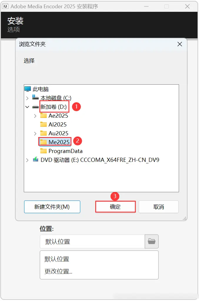 4.修改安装位置:①点击需要将软件安装的磁盘位置(如:D盘)②新建一个【Me2025】文件夹并选中③点击【确定】。