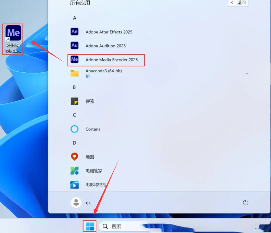 8.创建桌面快捷方式:点击桌面任务栏中的【开始图标】>点击【所有应用】,将【Adobe Media Encoder 2025】图标拖到电脑桌面。