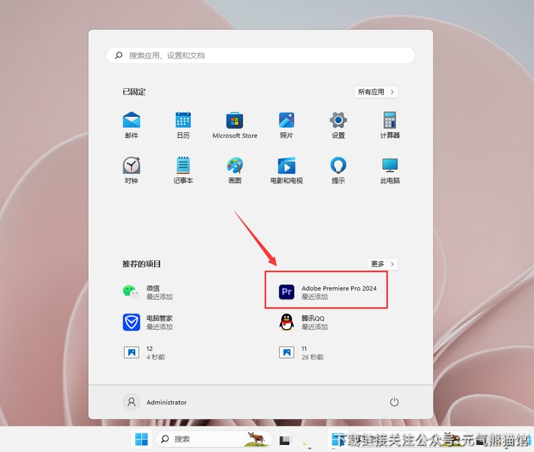 6.创建桌面快捷方式:点击桌面任务栏中的【开始图标】>点击【所有应用】,将【pr 2024】图标拖到电脑桌面。