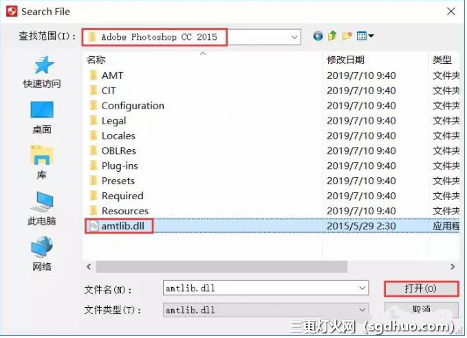 11.打开第8步选择的安装位置即D:\Adobe Photoshop CC 2015,找到并选择amtlib.dll,点击打开