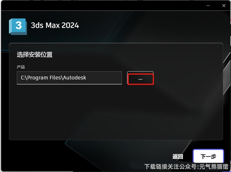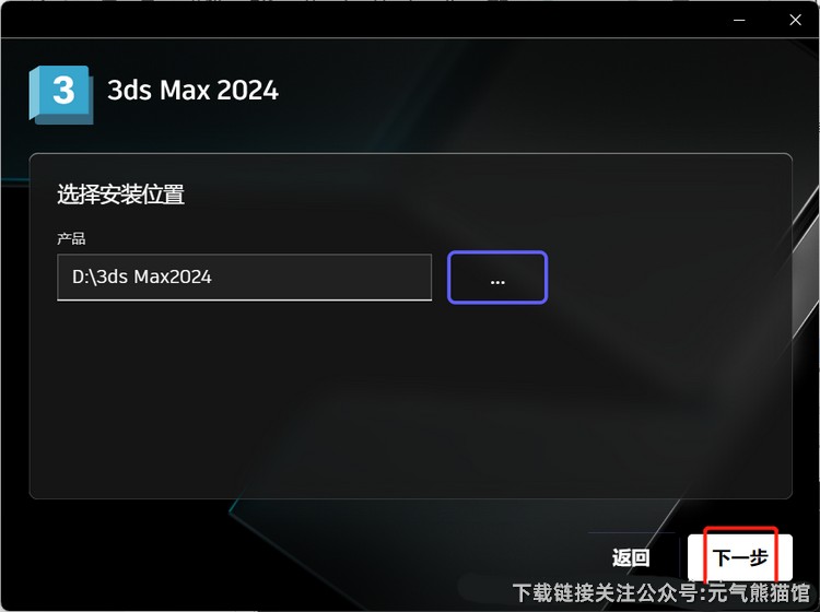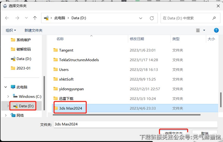 7.①选择需要将软件安装的磁盘(如:D盘)②新建一个【3ds Max2024】并选中③点击【选择文件夹】。