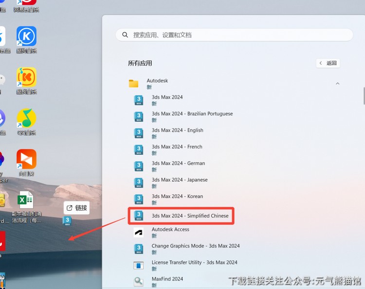 18.创建桌面快捷方式:①点击桌面任务栏中的【开始图标】>点击【所有应用】>双击展开【Autodesk】文件夹②将【3ds Max 2024 - Simplified Chinese】图标拖到电脑桌面。