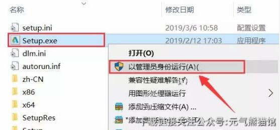 4.选中【Setup】可执行文件,鼠标右击选择【以管理员身份运行】。