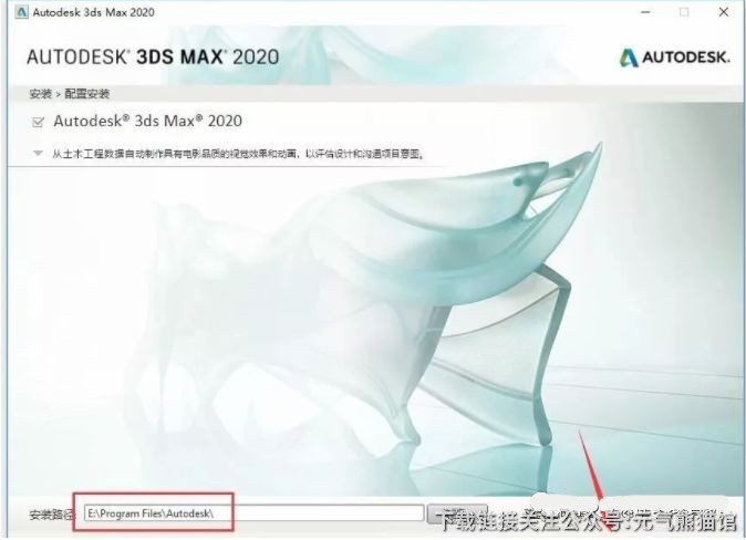 7.点击【浏览】更改软件的安装路径,建议安装在除C盘之外的其他磁盘,可以在E盘或其他盘新建一个【3dsmax2020】文件夹,然后点击【安装】。