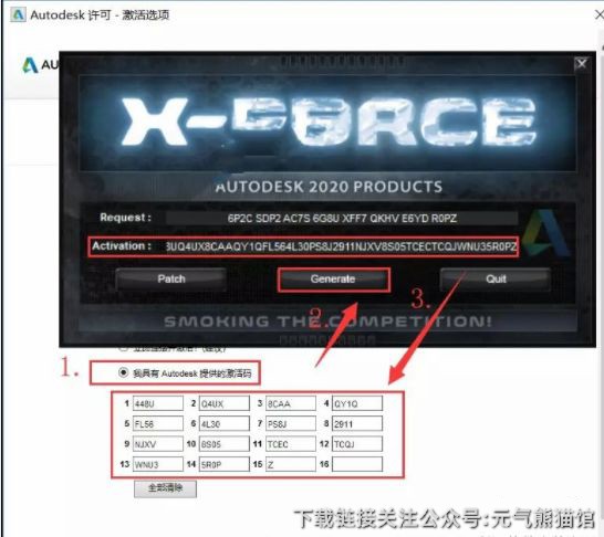 23.选择【我具有Autodesk 提供的激活码】然后点击【Generate】,使用快捷键Ctrl+C复制注册机中生成的激活码,然后使用快捷键Ctrl+V粘贴到软件的激活码输入框中。