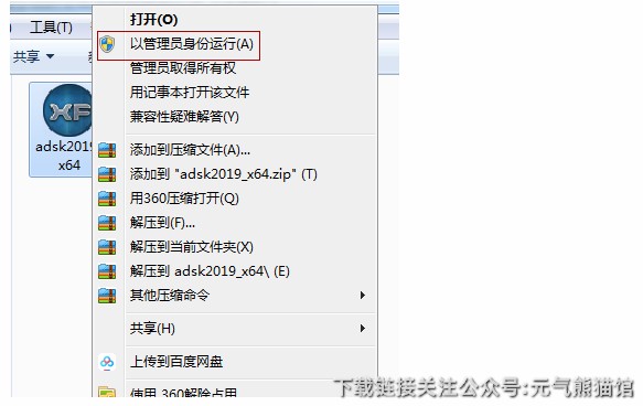 18.选中【adsk2019_x64】后,鼠标右击选择【以管理员身份运行】。温馨提示:若打开注册机文件夹后里面没有注册机程序,则需要关闭你电脑杀毒软件和防火墙后再重新解压安装包后打开。
