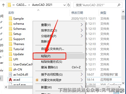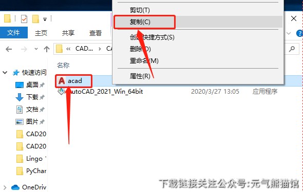 10.返回到开头解压的【CAD2021】文件夹中,鼠标右击【acad】文件选择【复制】。