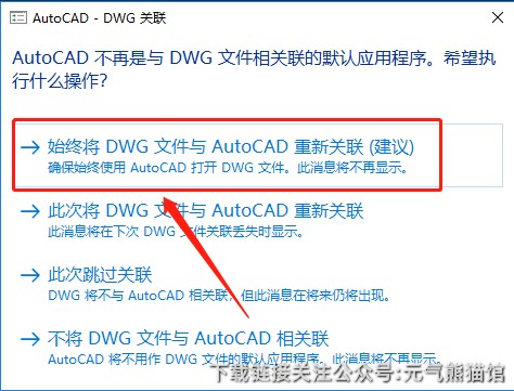 15.若出现下图所示的界面,直接点击【始终将DWG文件与AutoCAD重新关联】(若没有该界面直接忽略)。