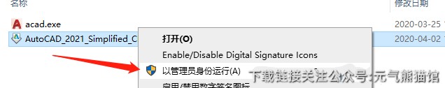 2.以管理员身份运行AutoCAD_2021_Simplified_Chinese_Win_64bit_dlm.sfx.exe程序。