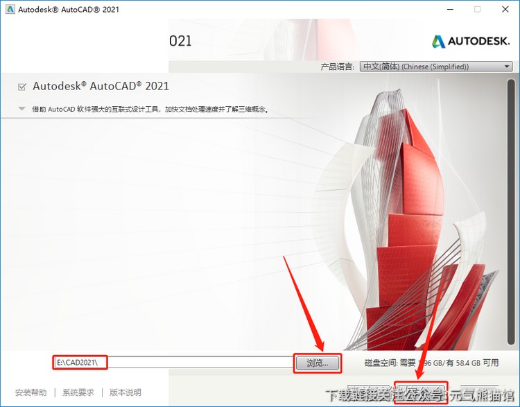 7.点击【浏览】设置CAD软件安装路径:建议安装到除C盘以外的磁盘,设置好安装路径后点击【安装】。
