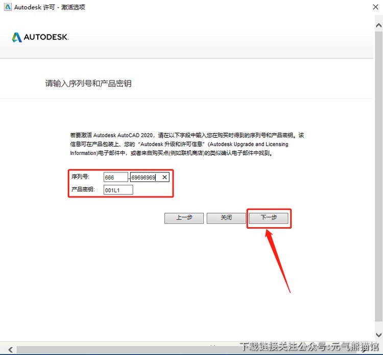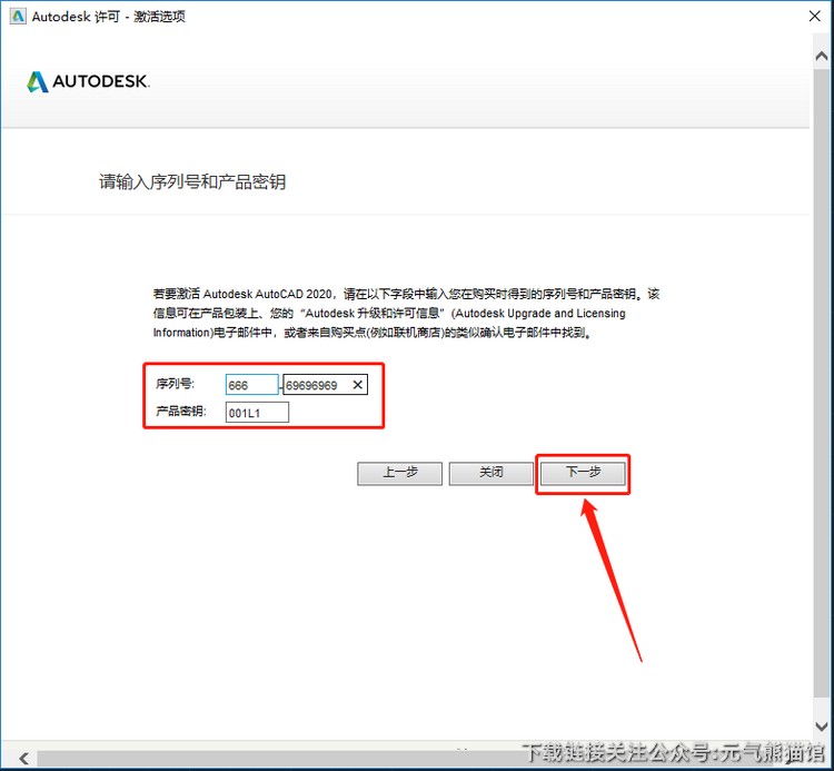 16.序列号输入【666-69696969】,产品密钥输入【001L1】,然后点击【下一步】。