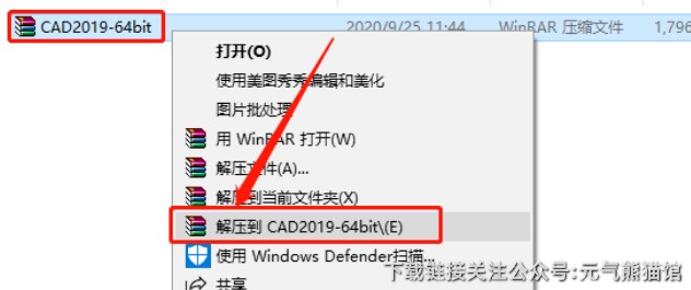 1、鼠标右击压缩包,选择解压到【CAD2019-64bit】。