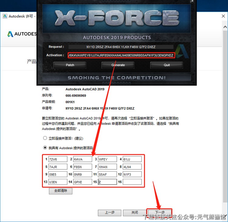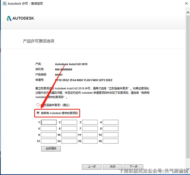 21、复制Activation方框中生成的激活码,粘贴至我具有Autodesk提供的激活码方框中,最后点击【下一步】即可。
