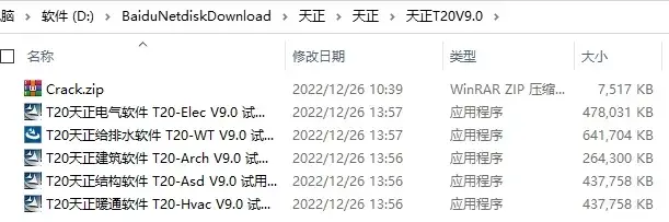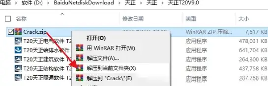 8.打开安装包解压后的【天正T20 V9.0】文件夹,鼠标右击【Crack】选择【解压到 当前文件夹】。
