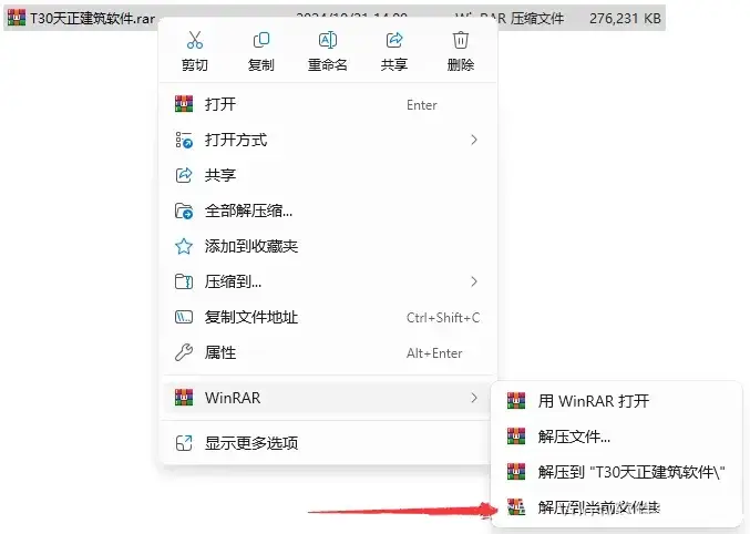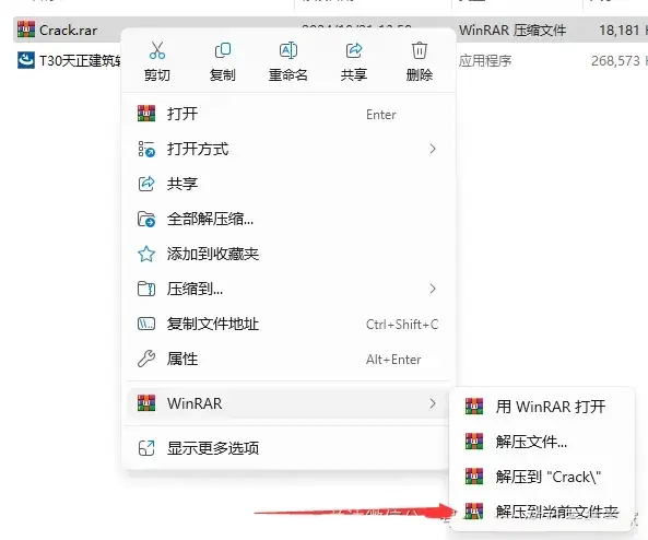 1.打开安装包解压后的【天正T30 V1.0】文件夹,①点击【解压到当前文件夹】。