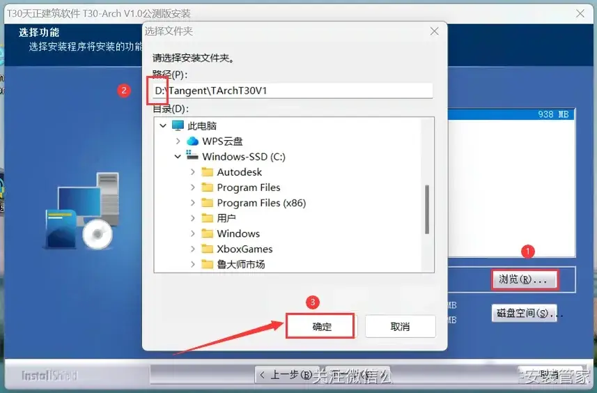 4.修改安装位置:①点击【浏览】②修改路径地址中的首字符C可更改安装位置(如:将C改为D表示安装到D盘)③点击【确定】。